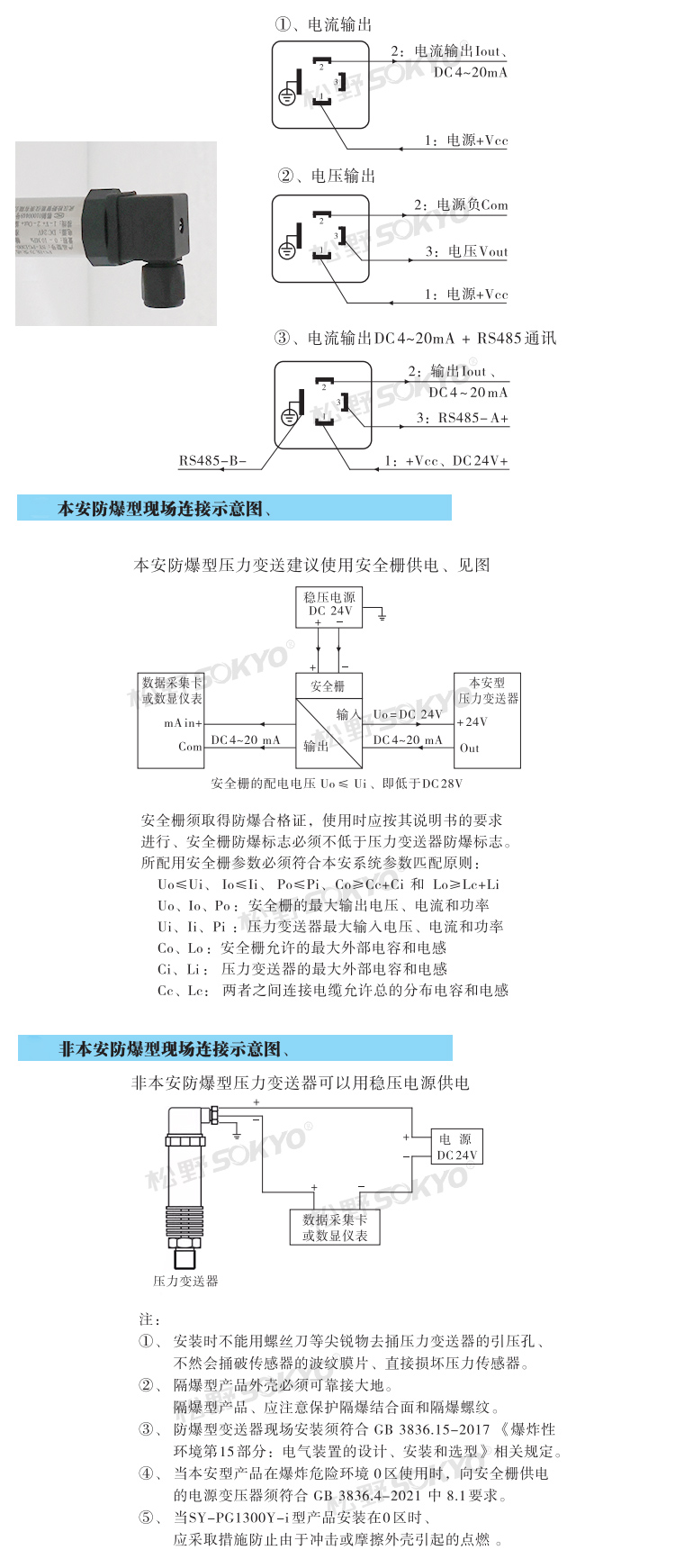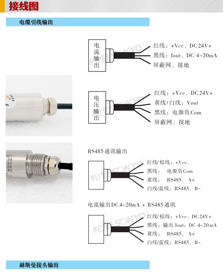 接線方式:標(biāo)準(zhǔn)電纜輸出、航空插頭輸出,赫斯曼接線頭輸出