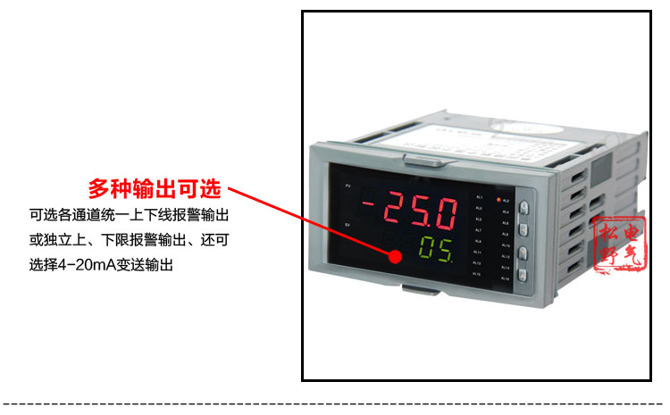 1、雙屏LED數(shù)碼顯示,PV顯示測量值,SV顯示當(dāng)前通道號(hào)。