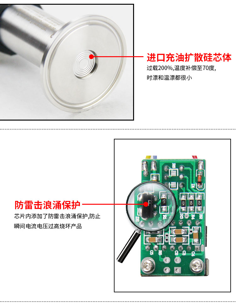 5、廣泛應(yīng)用于食品、醫(yī)藥、釀酒等衛(wèi)生型行業(yè)的壓力、或液位的檢測、特別是測量介質(zhì)可能結(jié)垢的場合。